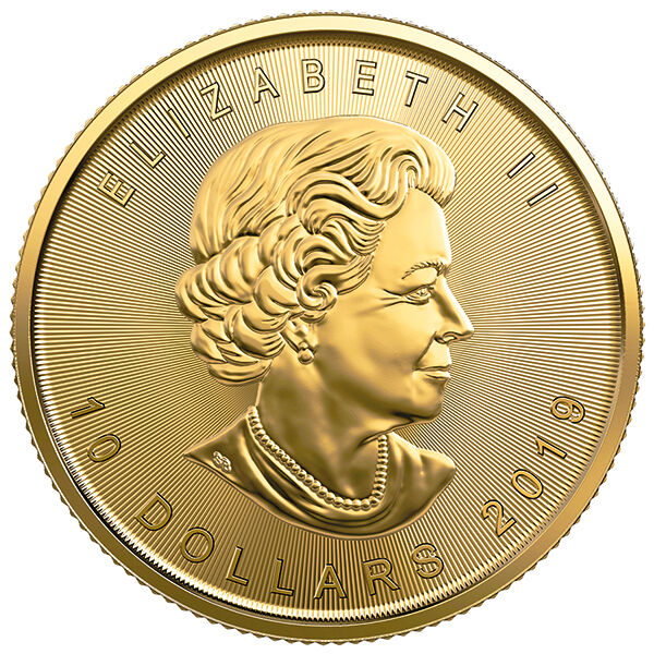 Interessenten finden bei uns im Sortiment die Maple Leaf Goldmünze mit einem Fein- und Raugewicht von 3,11 g in guter handelsüblicher Qualität und einem Feingoldanteil von 999,9/1000. Bis heute zählt der Maple Leaf zu einer der beliebtesten Goldmünzen und zeigt sich bei Investoren und Sammlern als begehrte und steuerfreie Anlagemöglichkeit.Zu Spitzenzeiten gehörte die Maple Leaf Goldmünze zu einer der gefragtesten und meistverkauften Bullionmünzen bereits seit 1976. Das charakteristische Design der Maple Leaf präsentiert sich auf der Vorderseite mit dem Porträt der ehemaligen britischen Monarchin Königin Elisabeth II. sowie dem Nominalwert des anerkannten Zahlungsmittels und dem Prägejahr. Auf der Rückseite findet sich Kanadas Nationalsymbol, das Ahornblatt (engl.: Maple Leaf), welches vom Schriftzug „CANADA“ umsäumt ist. Rechts und links davon befinden sich die Angaben zu ihrem Feingoldanteil, darunter das entsprechende Gewicht in der Einheit Unze (Ounce).Wichtig: Die Abbildungen dienen als Referenz, der Jahrgang des tatsächlichen Produkts kann abweichen.