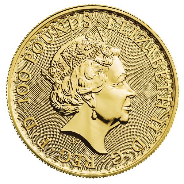 Auf der Wertseite der Britannia Goldmünze zeigt traditionell das Porträt des jeweils regierenden britischen Monarchen. Bis 2023 war darauf Queen Elizabeth II abgebildet. Dieses wurde im Laufe der Jahre mehrmals angepasst, um ihr Alter entsprechend widerzuspiegeln. Weiterhin finden sich am Rand:
