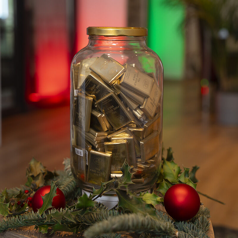 In der Geschäftsstelle des Veranstalters befindet sich ein gläsernes Gefäß, welches mit Goldbarren aus Schokolade befüllt ist und das während der regulären Öffnungszeiten der Geschäftsstelle begutachtet werden kann. Eine Abbildung dieses befüllten Gefäßes ist zudem auf der o.g. Gewinnspiel-Website des Veranstalters einsehbar.