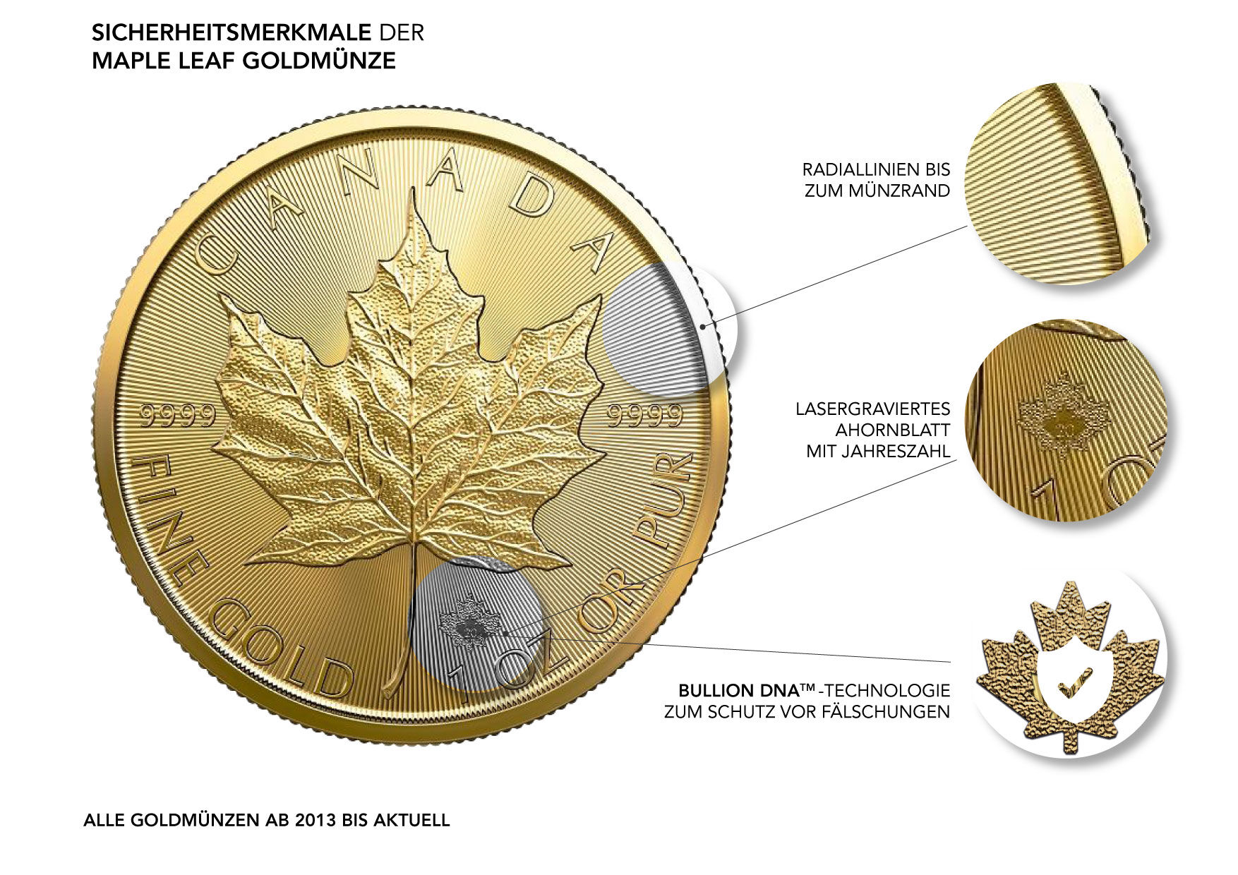 Durch diese zusätzliche Sicherheitsebene wird dafür gesorgt, die Goldmünze Maple Leaf zu einer der sichersten ANlagemünzen der Welt zu machen.